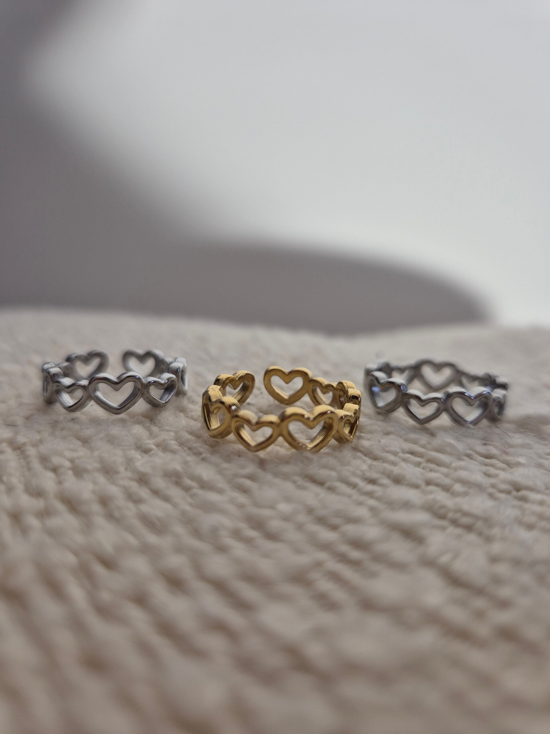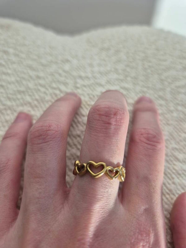 Cette bague en acier inoxydable évoque le romantisme et la tendresse grâce à son motif en forme de coeur repété. Ajustable et résistante, elle ne noircit pas.